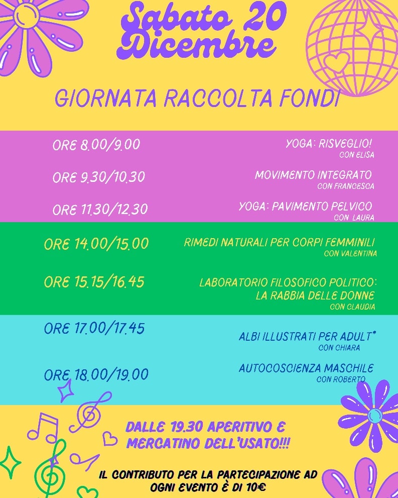 La partecipazione ad ogni attività (aperte a tutt*, anche alle persone esterne) richiede un contributo di 10€, con prenotazione obbligatoria con messaggio whatsapp al 3779807029.
