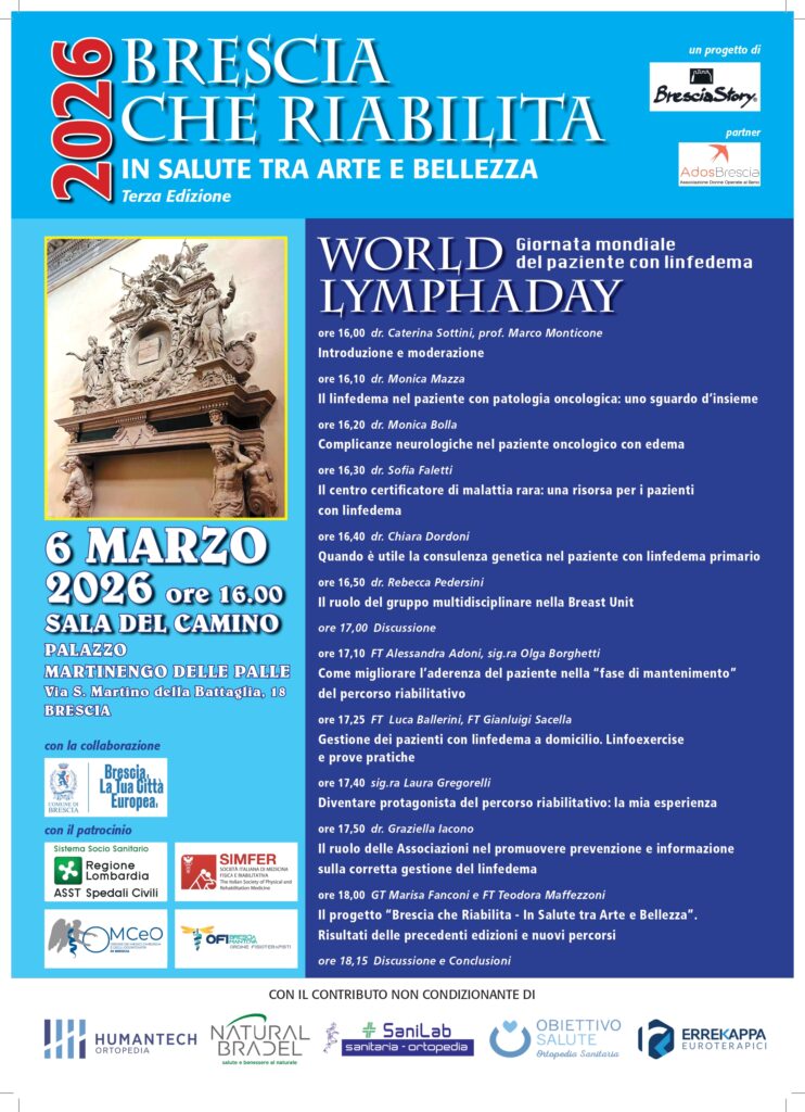 Il primo appuntamento, un evento gratuito ad ingresso libero rivolto a tutti, è organizzato in occasione della GIORNATA MONDIALE DEL PAZIENTE CON LINFEDEMA, e si svolgerà venerdì 6 marzo dalle 16 alle 18.30 nella splendida cornice dello storico Palazzo Martinengo delle Palle (Sala del Camino) sito in via San Martino della Battaglia, 18 a Brescia. Durante il pomeriggio verranno affrontate diverse tematiche relative al percorso diagnostico, terapeutico e riabilitativo del paziente con linfedema secondario post oncologico o con linfedema primario da malattia rara, di cui l’ASST Spedali Civili è centro di riferimento.